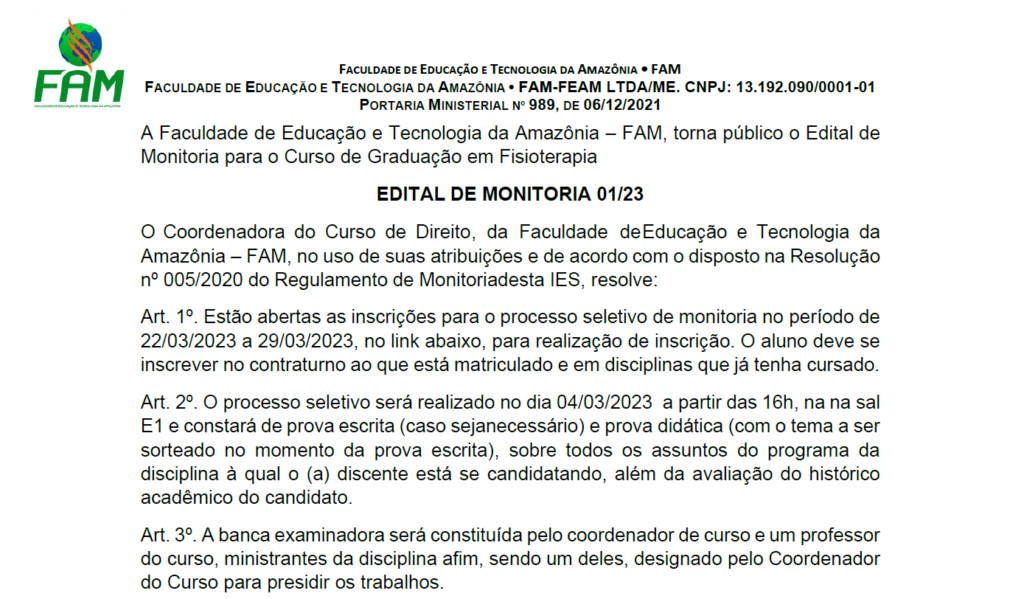 A Coordenação do Curso de Direito da Faculdade de Educação e Tecnologia da Amazônia – FAM, no uso de suas atribuições e visando à seleção de monitores para o segundo semestre do ano de 2024, torna público o presente edital que regulamenta o processo seletivo para a monitoria do curso de Direito.