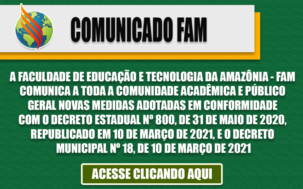 Comunicado A Faculdade de Educação e Tecnologia da Amazônia – FAM comunica a toda a comunidade acadêmica e público geral novas medidas adotadas em conformidade com o Decreto Estadual Nº 800, de 31 de maio de 2020, republicado em 10 de março de 2021, e o Decreto Municipal Nº 18, de 10 de março de […]