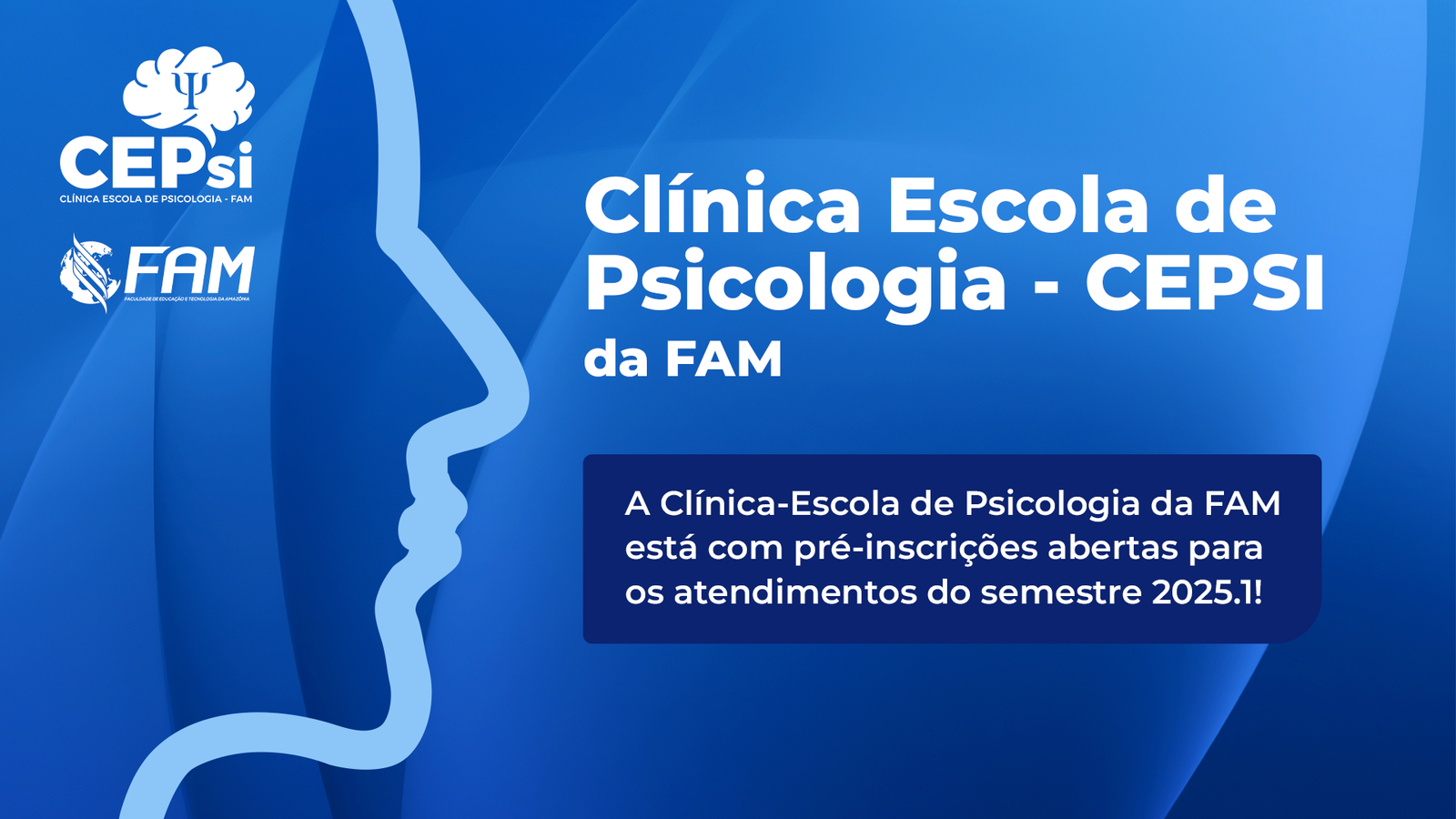 A Clínica-Escola de Psicologia (CEPSI) da Faculdade FAM está com pré-inscrições abertas para os atendimentos do semestre 2025.1! Este é um espaço dedicado à formação acadêmica dos estudantes de Psicologia e ao atendimento psicoterapêutico acessível à comunidade.